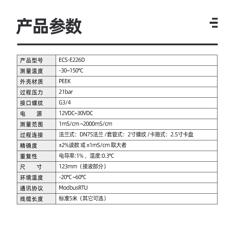 描述:上海博取儀器數(shù)字感應(yīng)式電導(dǎo)率酸堿濃度計PEEK高溫型,測量范圍 0.5-2000mS/cm,精度 ±2% 讀數(shù)或 ±1mS/cm,內(nèi)置 Pt1000 實(shí)現(xiàn)溫度自動補(bǔ)償。IP68 防護(hù),支持 12-30V DC 供電與 Modbus RTU 通訊,適配法蘭、套管等 7 種安裝方式,可用于火電、化工等領(lǐng)域,支持標(biāo)準(zhǔn)液 / 五點(diǎn)校準(zhǔn),運(yùn)維便捷。